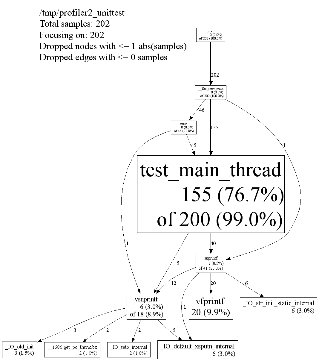 Note that test_main_thread() has an edge to vsnprintf(), even though test_main_thread() doesn't call that function directly. This is because the code was compiled with -O2; the profile reflects the optimized control flow.